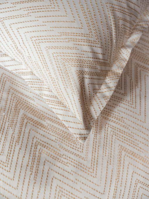 Zeva er et elegant sengesett i jaquardvevet sateng av fineste langfibrede bomull, TC 300. Det delikate sikksakkmønsteret i lys sand mot hvitt gir et tidløst og eksklusivt uttrykk. Mykt, svalt og komfortabelt – perfekt året rundt, og en sikker favoritt for den som verdsetter kvalitet.