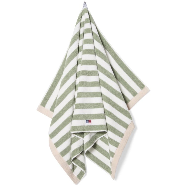 Block striped håndkle i vintage grønn, hvit og moonbeam bringer klassisk kysteleganse til badet ditt. Laget av 600g ringspunnet frotté i bomull, tilbyr dette håndkleet eksepsjonell mykhet og absorberingsevne, og kombinerer tidløs blokkstriped design med premium kvalitet. Den brettede kontrastkanten med jacquard-tekstlogo gir en raffinert avslutning, og gjør det både funksjonelt og vakkert designet.